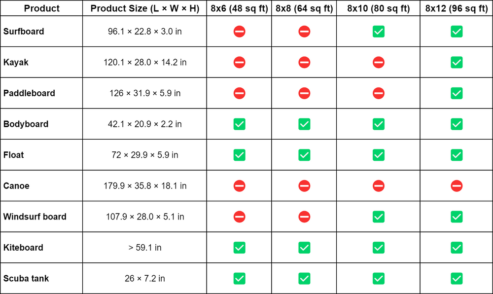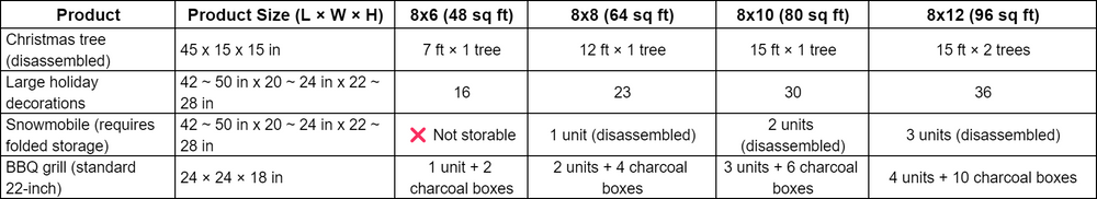 Maximum item capacity for different sizes