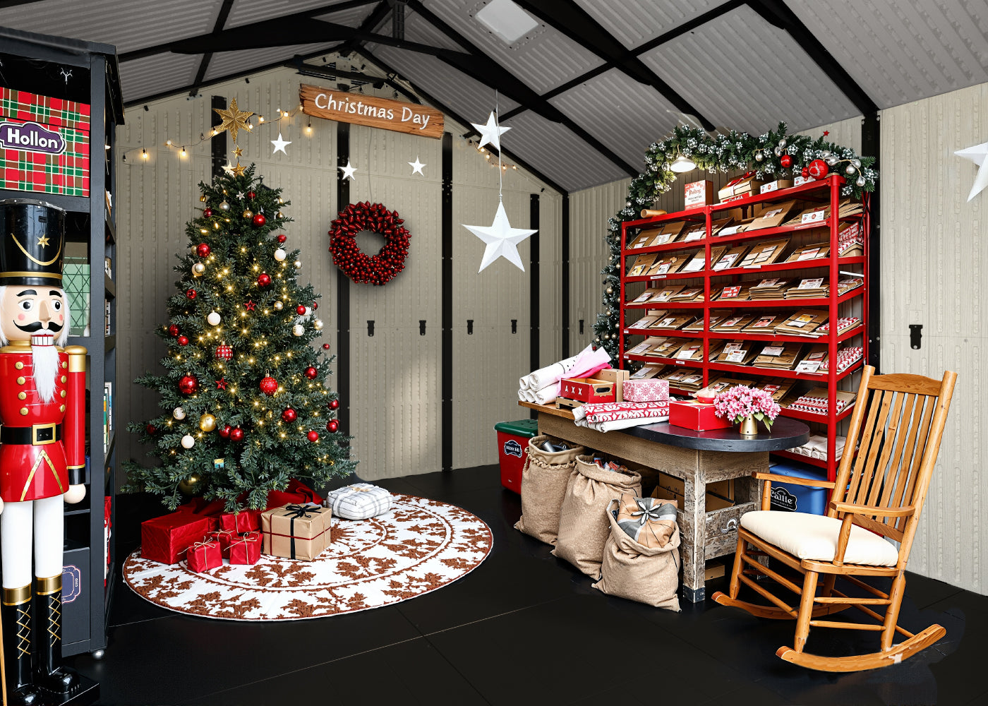 Transform your shed into Santa's Secret Workshop! The perfect place for him to finish his gift-wrapping and toy-checking on Christmas Eve.