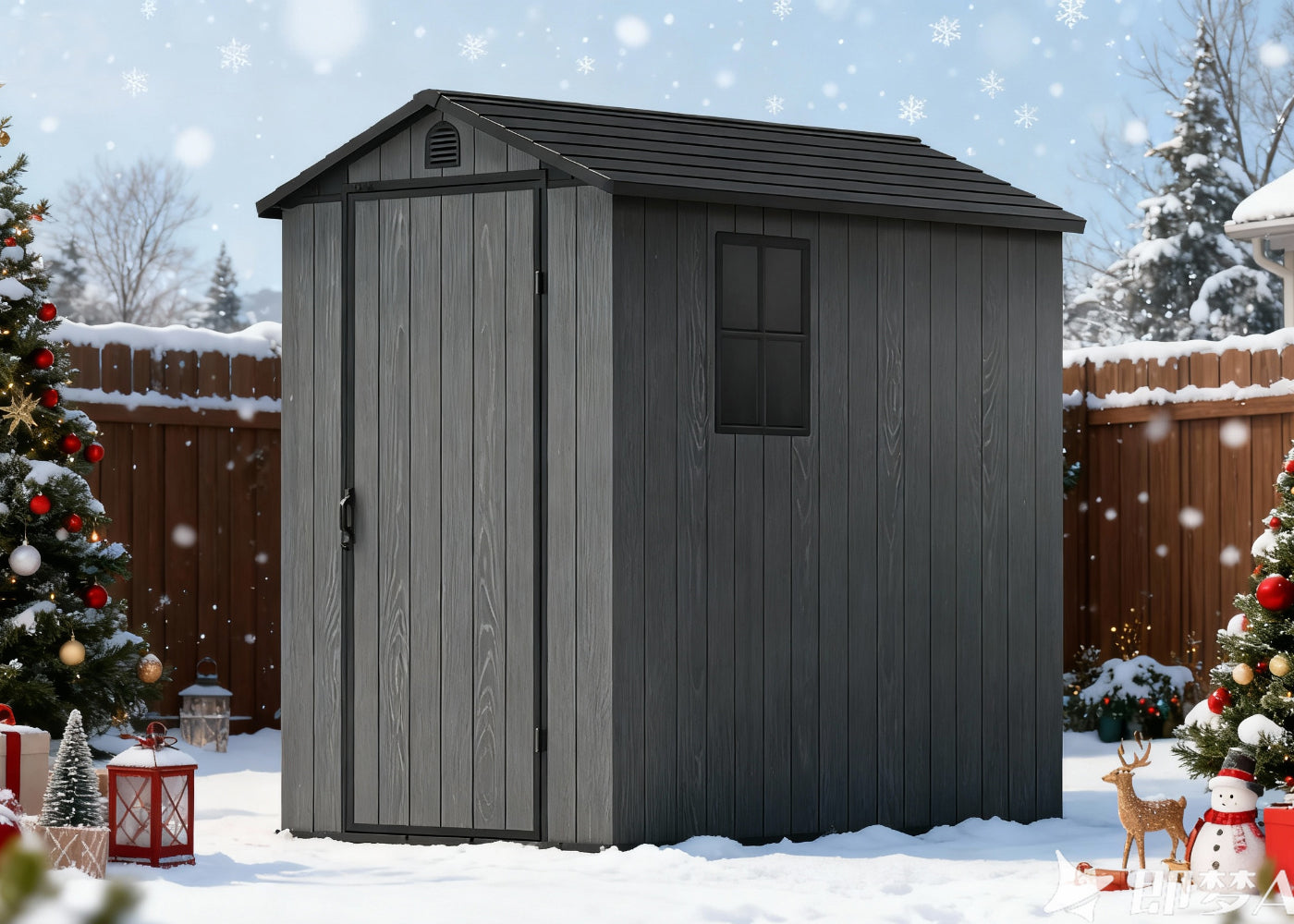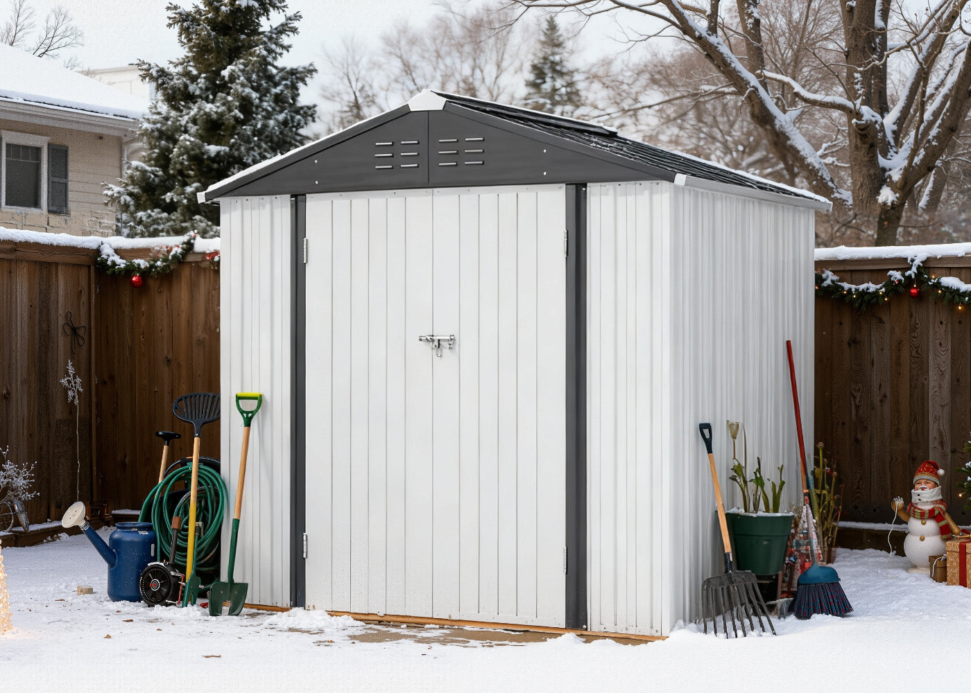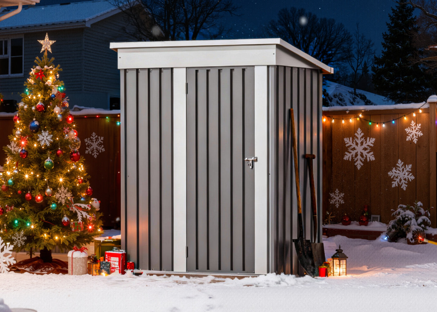 The heart of your magical light display! Keep all your sequencing equipment, extension cords, and tech gear safe, dry, and organized in your sturdy metal shed. Hang a few strings of lights, drape a wreath over the door, add some streamers, or even place a small Christmas tree in front of the shed to infuse your garden with holiday che