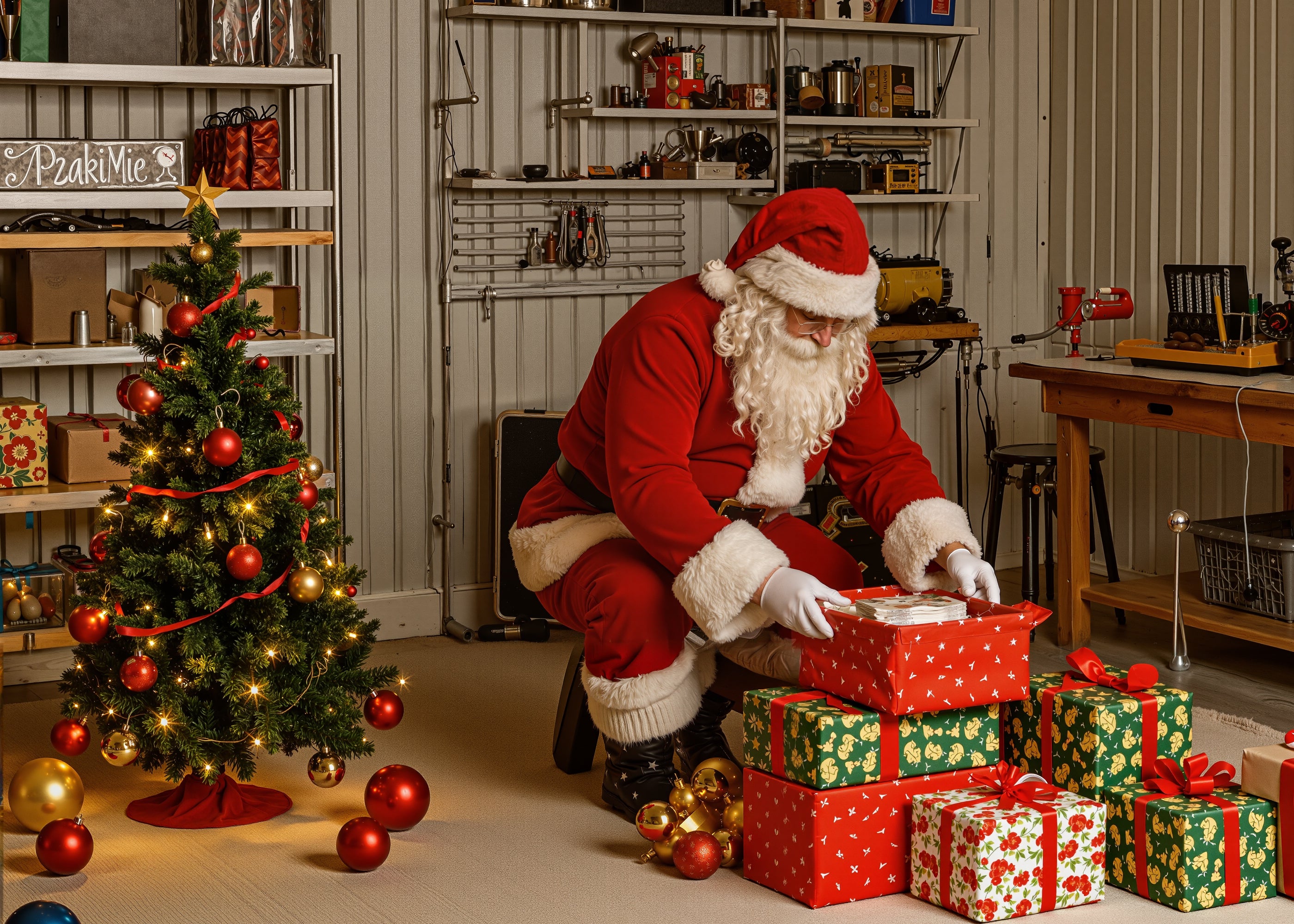 Fits a narrow workbench or folding table for gift wrapping, with gifts stacked in the corner. Space allows only one Santa Claus to turn and work.