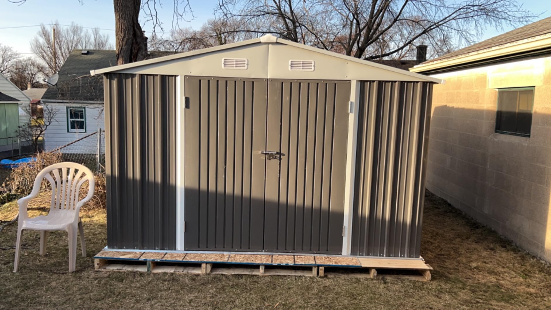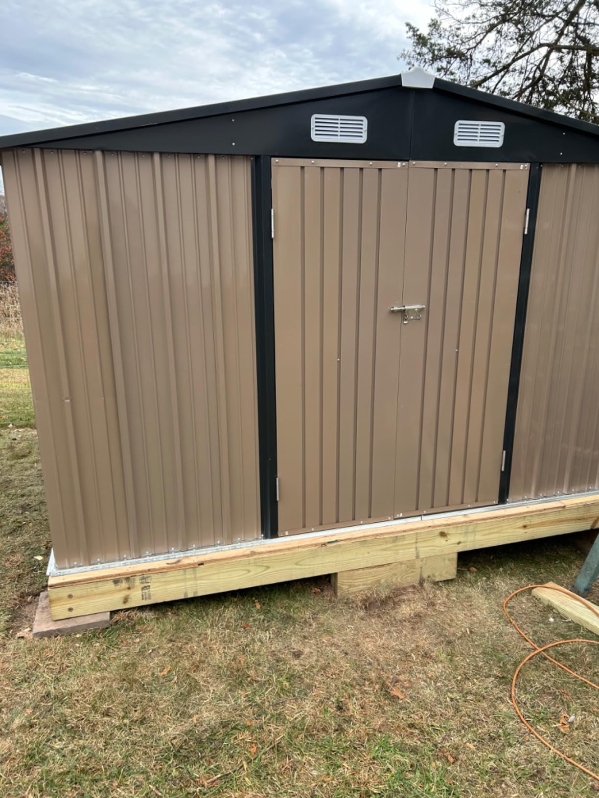 Built-in vents promote airflow, reducing moisture buildup and protecting your belongings from mold and mildew in this storage shed.