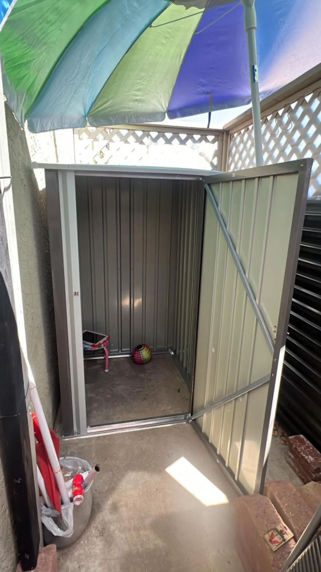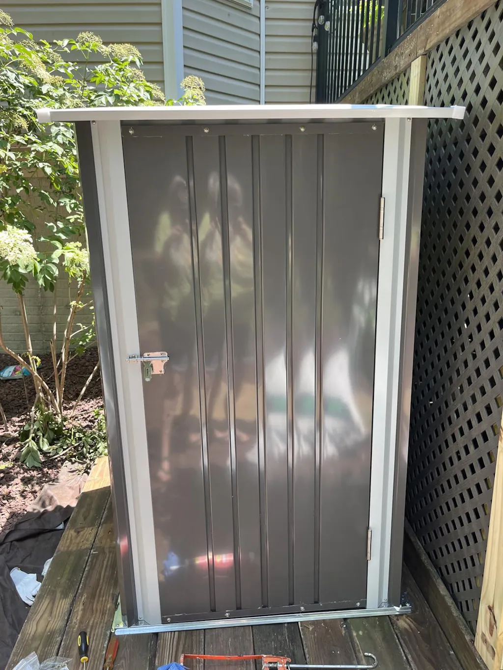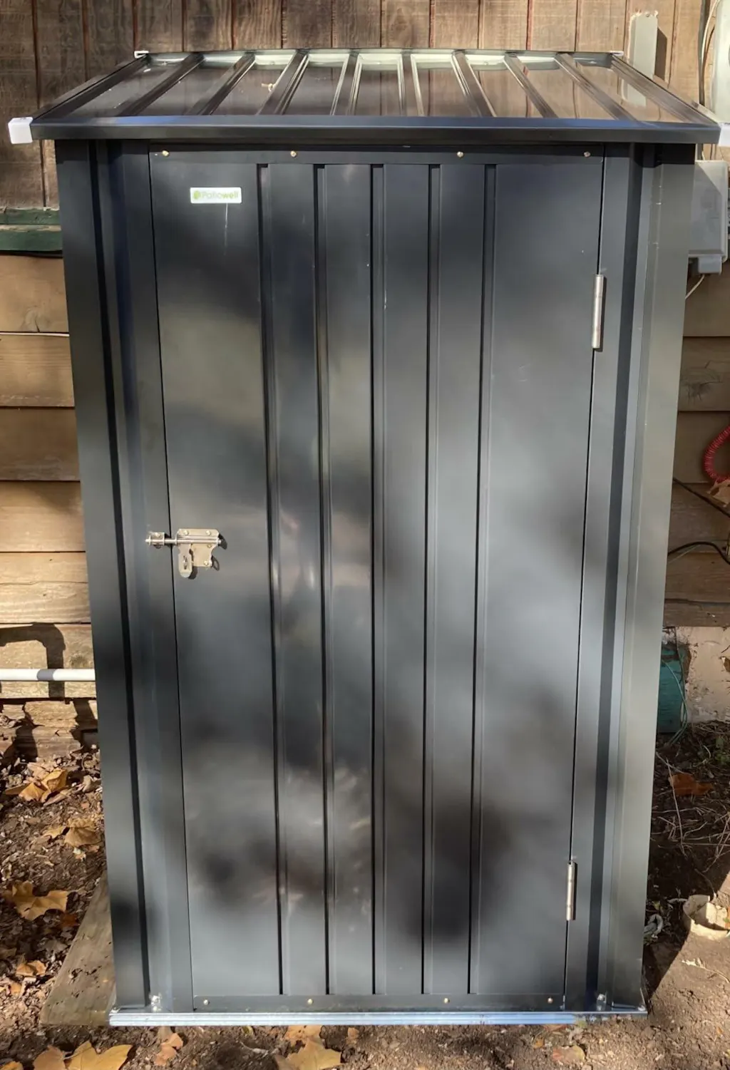 3x3 metal storage shed standing in backyard