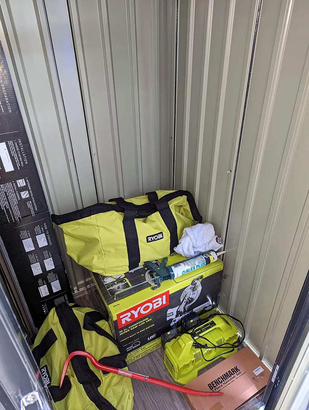 a brown metal storage shed is filled with music instrument