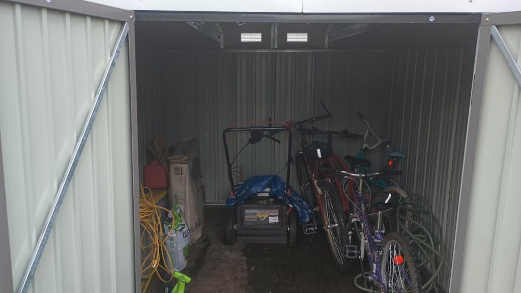 Features built-in vents that promote airflow, reducing moisture buildup and protecting your belongings from mold and mildew in this storage shed.